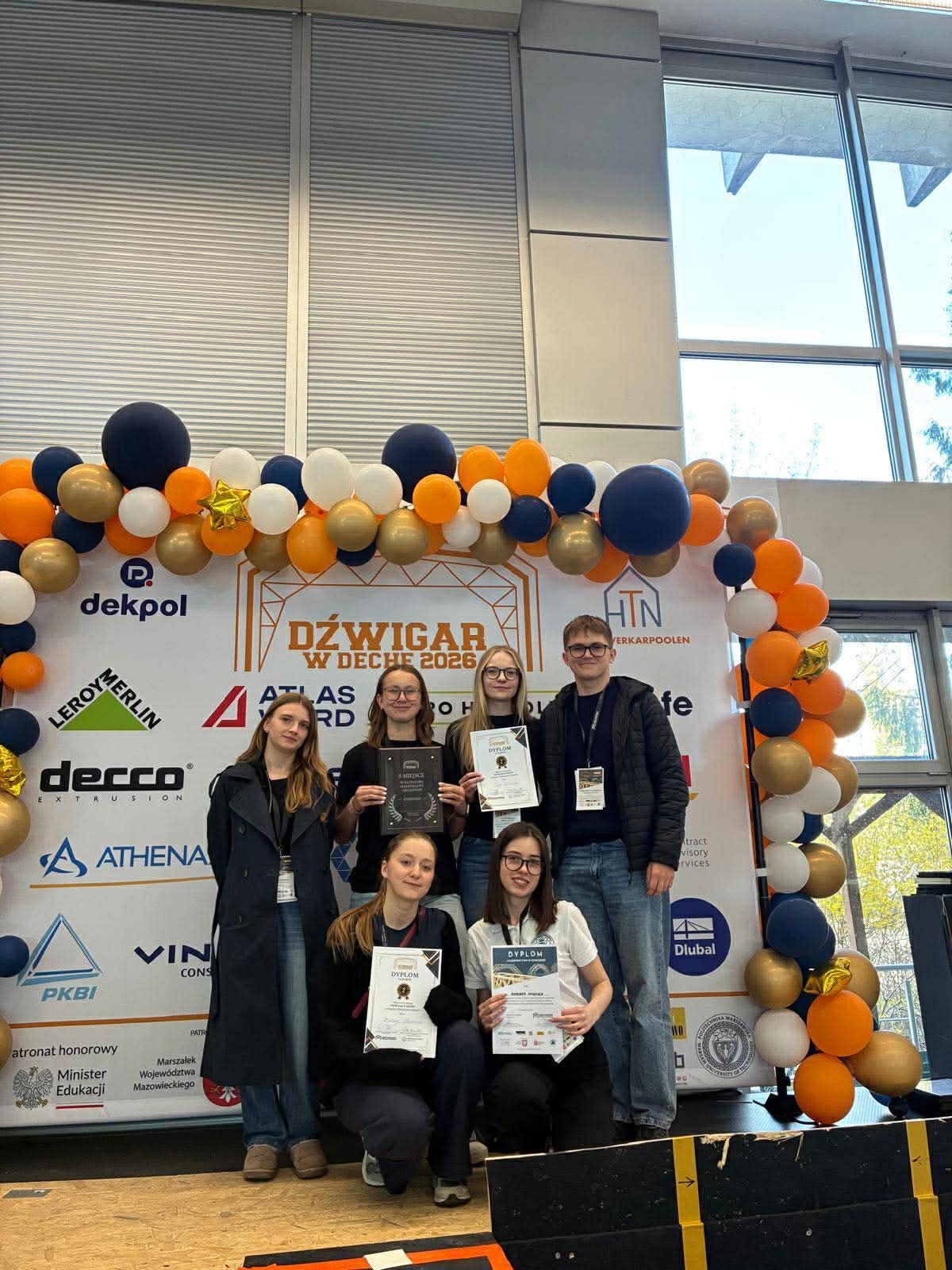 Nasi studenci z Koła Naukowego Studentów Budownictwa mieli przyjemność uczestniczyć w konkursie „Dźwigar w dechę”, który odbył się w piątek i sobotę 17-18.04.2026. W ramach konkursu zespoły budowały własny dźwigar z drewna o maksymalnej masie 1 kg i minimalnej rozpiętości 1,5 m, a potem na miejscu przeprowadzali próbę obciążeniową.