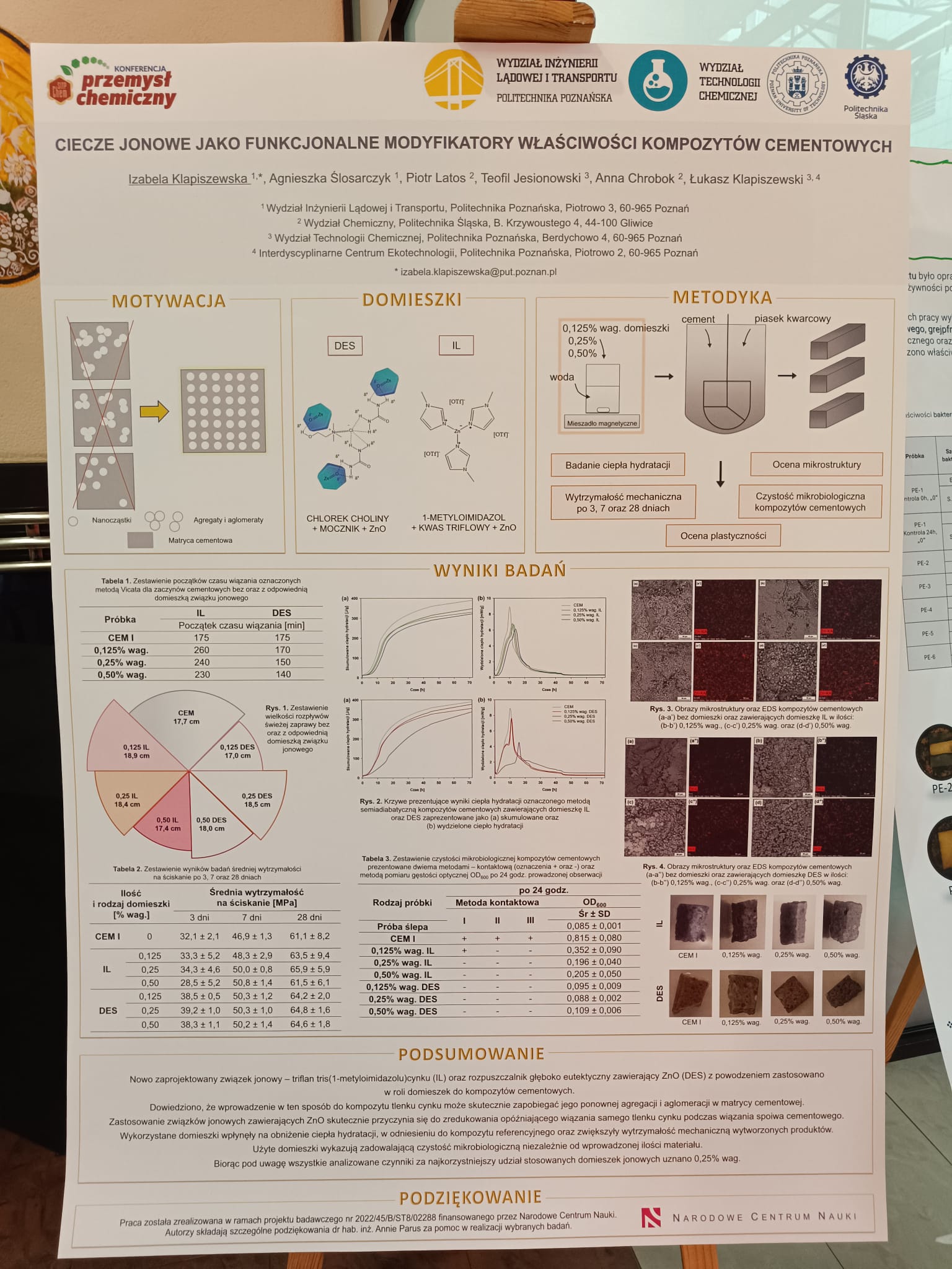 Miło nam poinformować, że pracownik naszego Wydziału, dr inż. Izabela Klapiszewska, zajęła I. miejsce za prezentację posteru pt. "Ciecze jonowe jako funkcjonalne modyfikatory właściwości kompozytów cementowych". Tematyka ta jest bezpośrednio powiązana z projektem OPUS nr 2022/45/B/ST8/02288, finansowanym przez Narodowe Centrum Nauki.